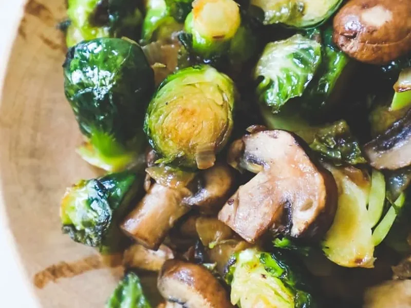 Prep vegetables (halve and stem brussels sprouts, dice onion, slice mushrooms, mince garlic) up to 1 day ahead. Cook the full dish no more than 4 hours before serving for best texture.