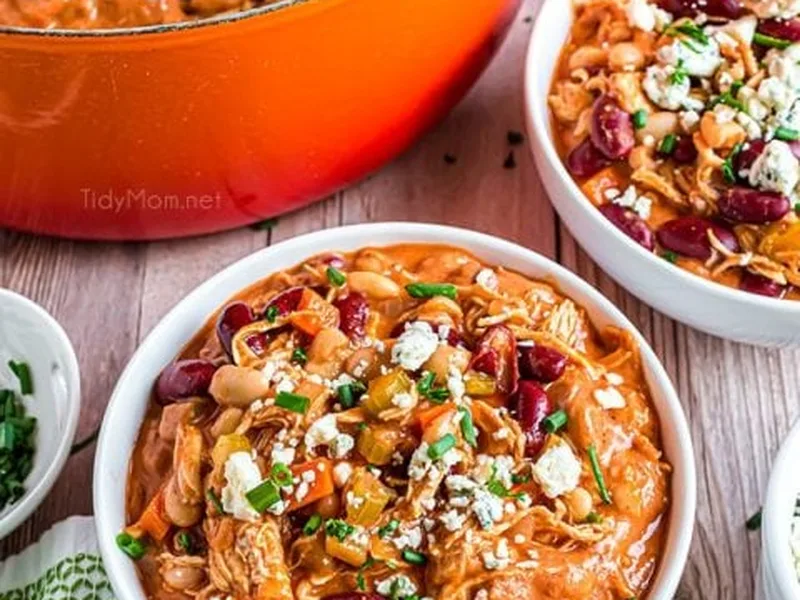 Spicy chili combining shredded chicken, kidney and great northern beans, and tomato base with buffalo hot sauce and cream cheese for richness. Topped with crumbled blue cheese for tangy finish. Quick weeknight comfort food with bold flavors and creamy texture.