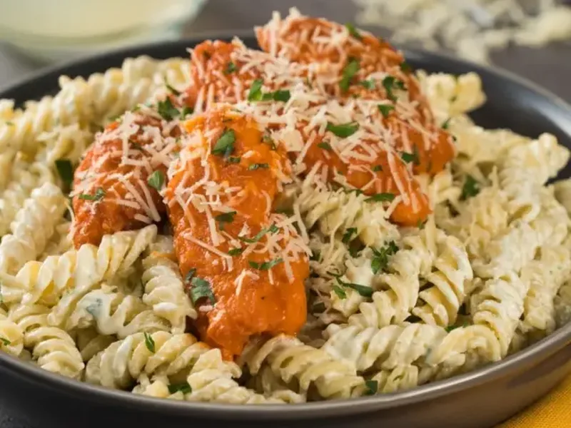 Serve pasta topped with buffalo chicken. Garnish with grated Parmesan and chopped parsley.