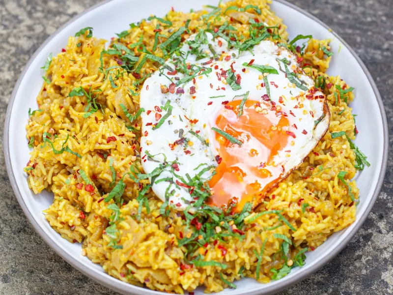 Fragrant basmati rice infused with cardamom, curry powder, turmeric and chilli, cooked in butter with caramelized onions and toasted pistachios. Topped with a crispy-edged fried egg and fresh mint with a squeeze of lemon. Low-heat cooking ensures the butter stays rich without burning.