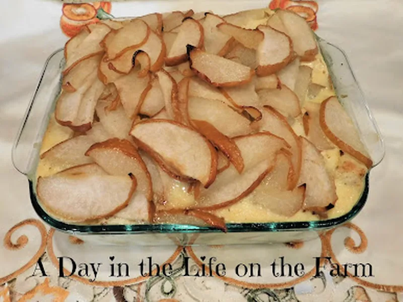 Use a 325-degree oven rather than higher heat. This low temperature sets the custard gently without browning the edges too quickly, allowing the center to cook through while pears caramelize on top.