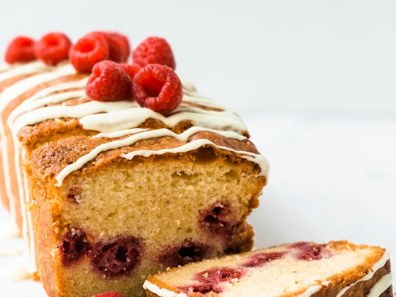 Creamed butter and sugar base studded with fresh raspberries and white chocolate chunks, baked in a round pan until golden. The crumb is kept tender by folding in self-rising flour with minimal mixing. A white chocolate drizzle and fresh raspberry garnish finish the cake.