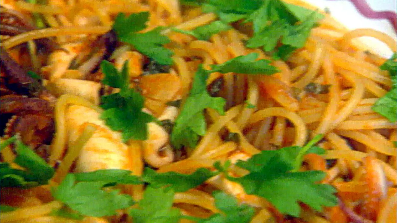 Tender calamari simmered in a rich tomato and white wine reduction, tossed with linguini or spaghetti. Garlic and shallot build a savory base while parsley brightens the finished dish. The squid cooks quickly at the end, staying tender and mild.