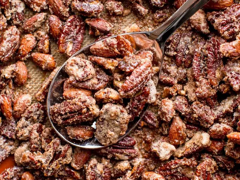 Roasted pecans and almonds coated in a crispy cinnamon-sugar shell. Egg white meringue clings to the nuts as they bake low and slow, creating a caramelized candy coating. Stir every 15 minutes for even toasting. Perfect for snacking, gifting, or holiday entertaining.
