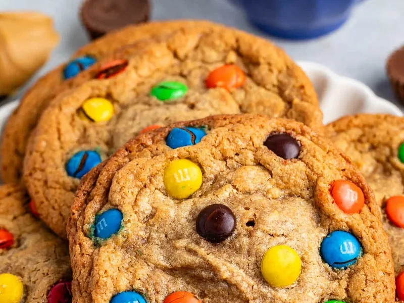 Indulgent no-flour peanut butter cookies packed with Reese's Peanut Butter Cup centers and colorful M&M toppings. These soft, chewy treats combine creamy peanut butter dough with hidden candy surprises, making them perfect for parties, bake sales, or satisfying serious sweet cravings. The wet dough creates incredibly tender cookies that stay soft for days, while the candy additions provide delightful texture contrasts and bursts of chocolate in every bite.