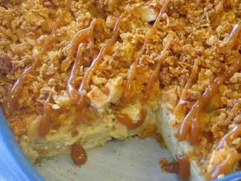 Toss corn flakes with melted butter and brown sugar just before assembly, then sprinkle and bake immediately. The butter seals the flakes temporarily. Add the caramel drizzle only after serving to preserve crunch.