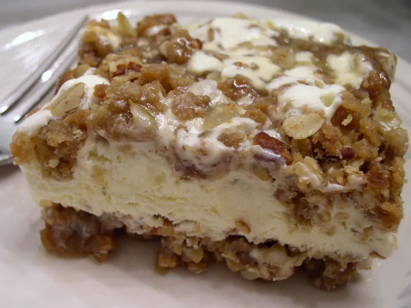 A decadent frozen layered dessert combining buttery oat-pecan crumble with softened vanilla ice cream and homemade caramel sauce. The crumble provides textural contrast and toasted flavor, while the rich caramel binds layers together. Serve cold as an indulgent make-ahead dessert for gatherings, potlucks, or when you need something impressive but simple. This version stands out for its homemade caramel sauce and freezer-friendly individual portions, making it practical for entertaining without last-minute assembly.