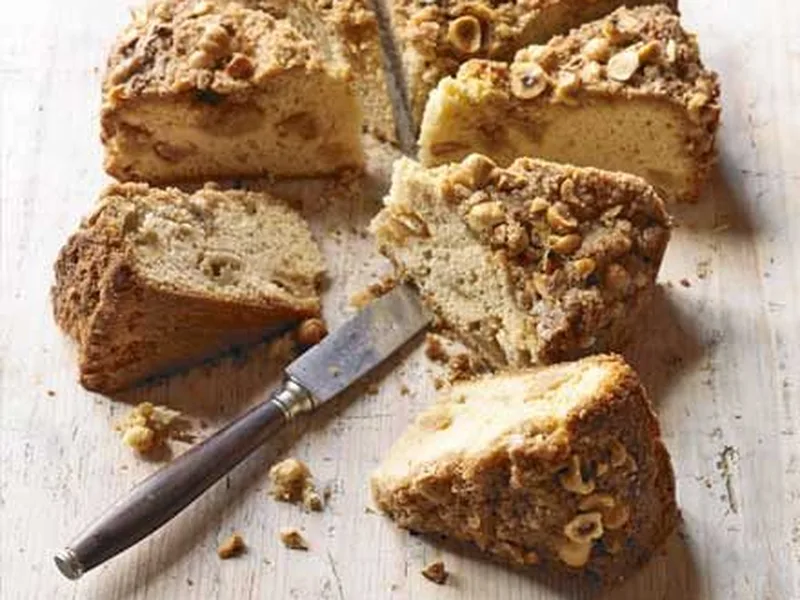 Buttery cake with caramelised apples folded through the batter, topped with a cinnamon-spiced crumb topping and toasted hazelnuts. The apples are cooked first until deeply browned in their own caramel, then swirled into tender cake batter. Baked until golden and a skewer comes out clean.