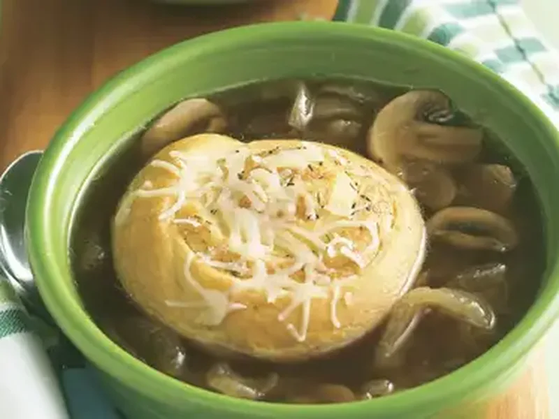 Caramelized Onion-Mushroom Soup with Cheesy Crescent Toppers