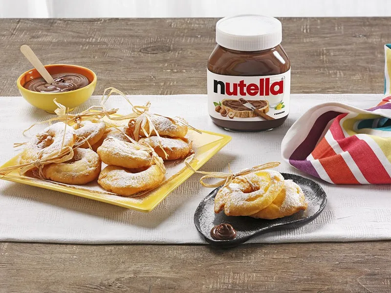 Whole apples cored and sliced thin, dipped in a simple batter of flour, eggs, milk, and baking powder, then deep-fried until golden. Dusted with icing sugar and served hot with a dollop of Nutella. A carnival-style treat that transforms fresh fruit into crispy, indulgent fritters.