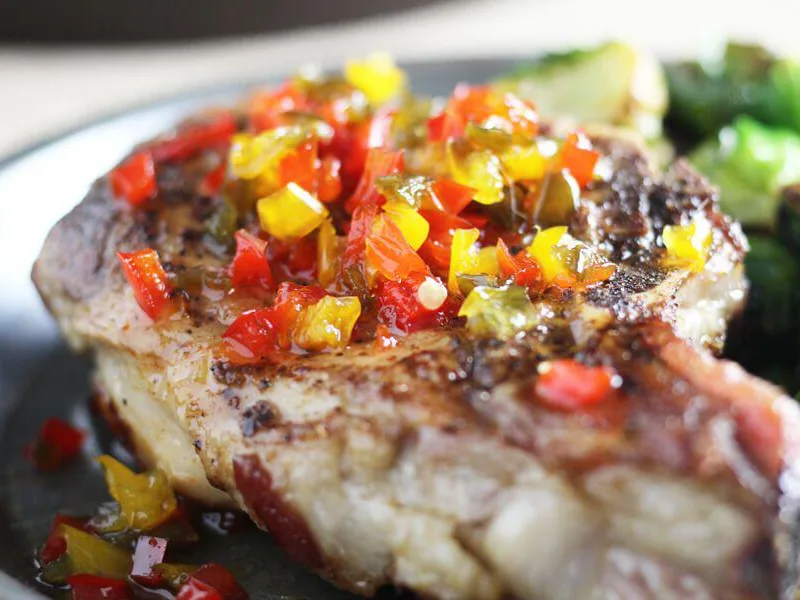 Bone-in pork chops seared in cast iron and finished in the oven, topped with homemade pepper jelly made from jalapeños, bell peppers, and apple cider vinegar. Tart-sweet and slightly spicy with a jammy glaze, this restaurant-quality dinner balances bright acidity against rich pork. Perfect for weeknight dinners or when impressing guests without fuss. The skillet-to-oven method ensures crispy exteriors and juicy centers while the pepper jelly cooks down to concentrated flavor.