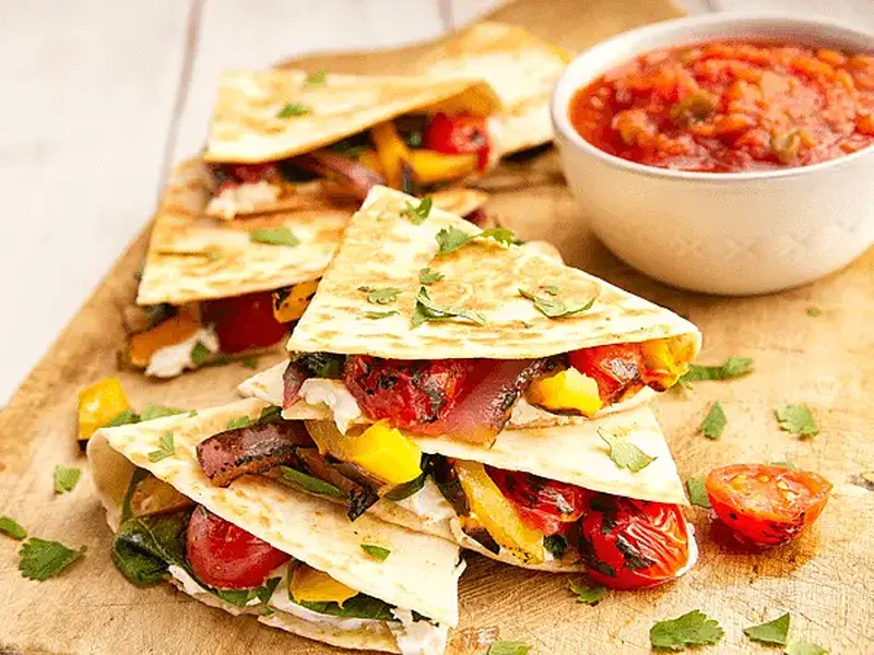 Crispy flour tortillas filled with charred capsicum, red onion, cherry tomatoes, creamy goat cheese, and fresh spinach, seasoned with fajita spice and pan-fried until golden. Served with salsa for dipping.