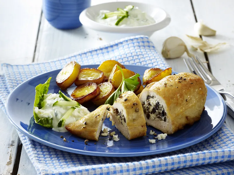 Blancs de poulet farcis au fromage de brebis is an elegant yet approachable French dish featuring tender chicken breasts butterflied and filled with crumbly sheep's cheese, olives, and garlic. The stuffed breasts are seared then gently finished in the oven, remaining succulent inside while developing a golden exterior. Crispy pan-fried potato slices provide textural contrast, while a cooling yogurt-cucumber sauce with fresh herbs balances the richness of the cheese and meat. This dish suits confident home cooks seeking restaurant-quality results without excessive complexity. Serve it as an impressive dinner party main course or special weeknight meal. What sets this version apart is the Greek-style yogurt sauce paired with raw cucumber and additional cheese mixed throughout, creating layered dairy flavors that echo the filling without overwhelming the palate.