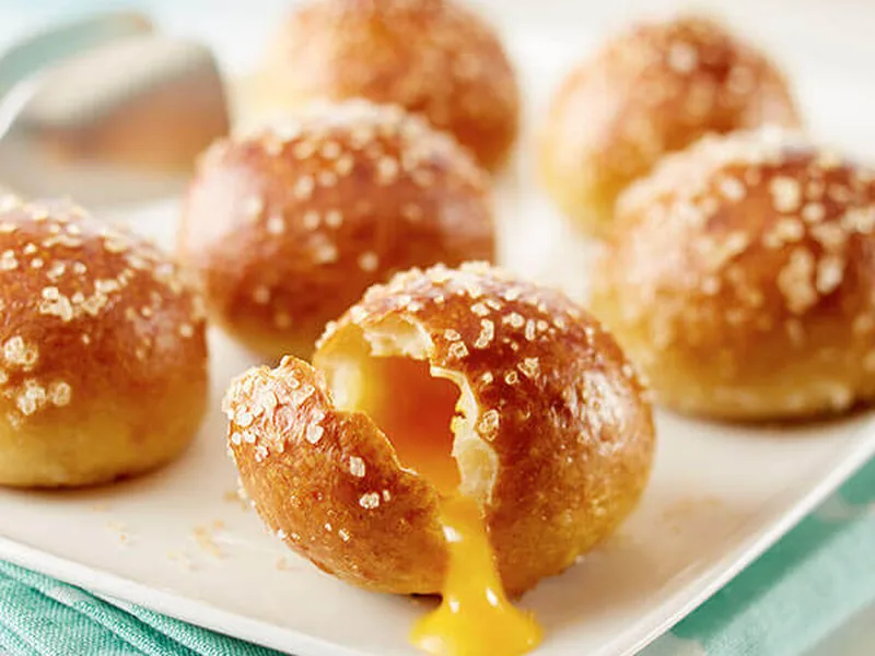 Transform frozen dinner rolls into bakery-style pretzel buns by stuffing them with sharp cheddar cheese and giving them the signature lye bath treatment that creates a dark, chewy crust with a soft interior. What makes this recipe special is the combination of a pretzel's distinctive tangy, caramelized exterior achieved through baking soda boiling and a melted cheese center that oozes when bitten into. The result balances salty, nutty pretzel flavor with creamy, sharp cheddar throughout. This recipe is perfect for home cooks seeking an impressive appetizer or side without extensive dough-making skills. Serve these warm as a standout party appetizer, alongside sandwiches, or as an unexpected bread course. This version stands apart by using convenient frozen rolls as a shortcut while maintaining authentic pretzel characteristics through proper boiling technique and finishing with coarse salt. The method ensures tender, fluffy insides contrasting with the chewy, caramelized exterior that defines superior pretzel buns.
