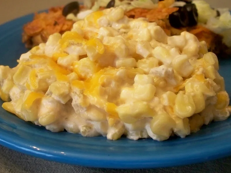 Creamy corn casserole with melted cream cheese, diced green chilies, and Colby-Monterey Jack cheese. A simple stovetop-to-oven side dish seasoned with garlic powder and Creole spices. The recipe uses one drained and one undrained can of corn for a saucy consistency.