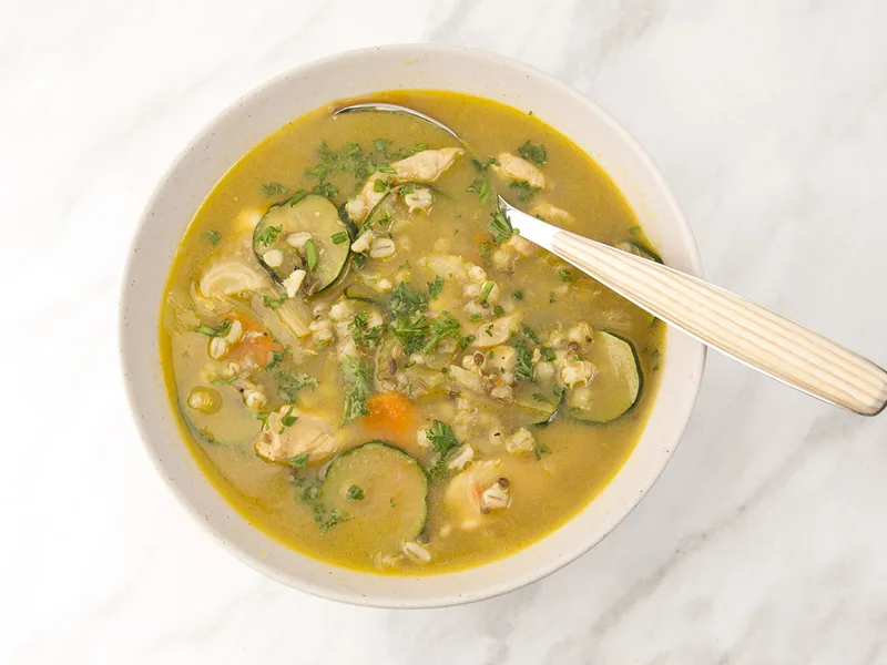 A rustic, warming chicken and vegetable soup enriched with toasted fennel and coriander seeds that create a deeply aromatic broth. Pearl barley adds heartiness and a tender, slightly chewy texture that makes this soup satisfying without heaviness. Fresh courgette, fennel, carrot, and celery provide natural sweetness and vegetal depth, while chicken breast keeps it lean and protein-rich. This is comfort food for anyone seeking nourishing, home-cooked meals—perfect for weeknight dinners, meal prep, or recovering from illness. Serve it hot with crusty bread. What sets this version apart is the two-stage cooking method: first toasting the spices to unlock their essential oils, then building flavors gradually with aromatics before the long, gentle simmer. The late addition of courgette preserves its delicate texture and vibrant color, while the finishing drizzle of extra virgin olive oil adds richness and a peppery note that brightens the whole bowl.