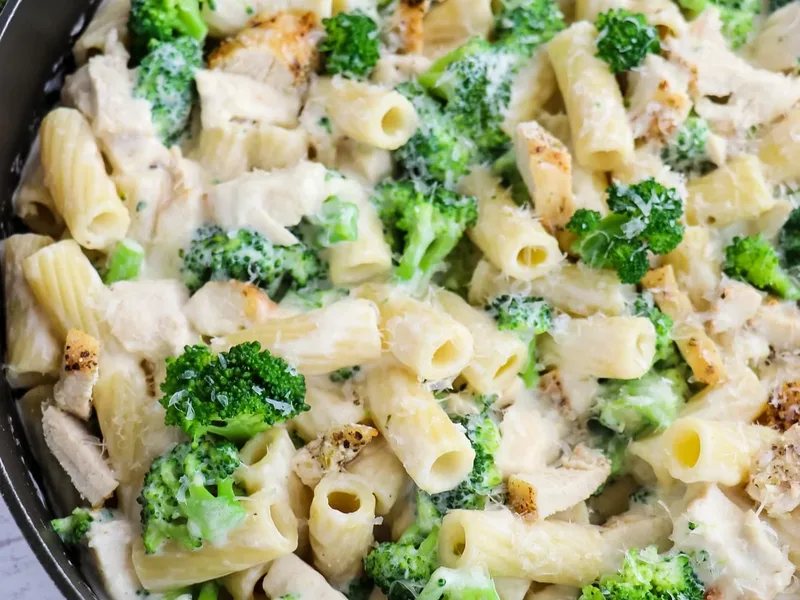Creamy Alfredo pasta dish combining al dente rigatoni, tender broccoli florets, and bite-sized chicken pieces in a rich butter and Parmesan sauce. The sauce is built from a roux, enriched with half and half, and finished with nutmeg for warmth. Quick weeknight dinner that comes together while pasta cooks.
