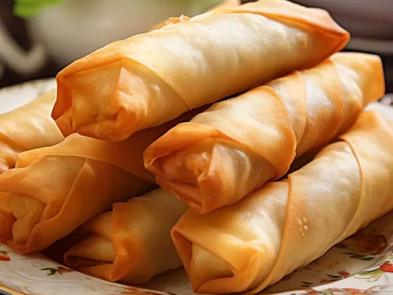 Homemade spring rolls filled with stir-fried chicken, mushrooms, ginger, and fresh vegetables, wrapped and deep-fried until golden. The chicken is seasoned with Chinese five-spice, soy, and oyster sauce, combined with rehydrated mushrooms, garlic, carrots, beansprouts, and spring onions. Served hot with dipping sauce.