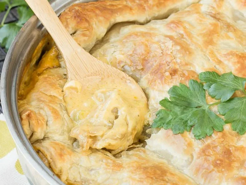 Cook the filling in a regular pan, then transfer to a baking dish before topping with puff pastry and baking.