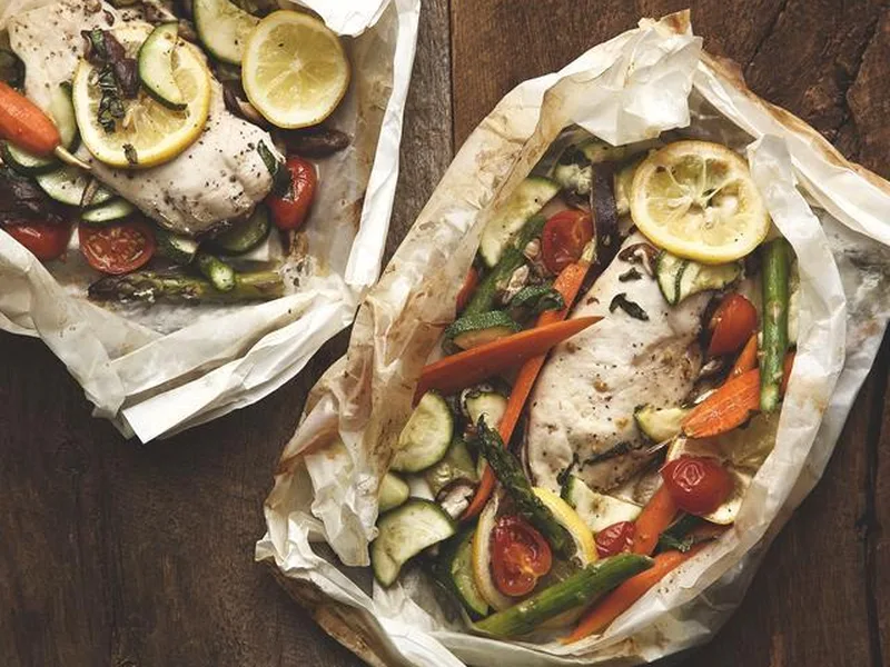 Tender chicken breast and fresh spring vegetables steamed in parchment packets with white wine, lemon, and basil. The en papillote method traps steam, keeping chicken moist while vegetables soften. Elegant enough for dinner guests, simple enough for weeknight cooking.