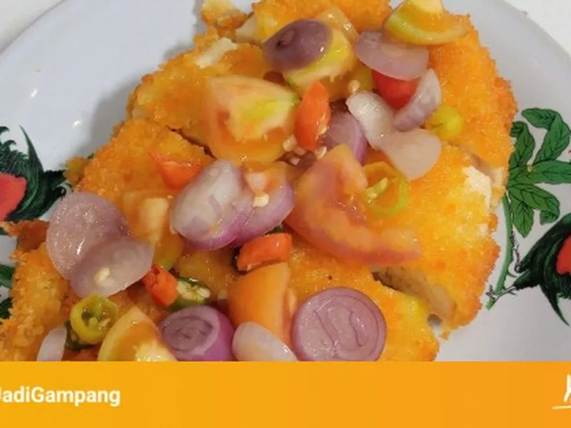 Indonesian-style breaded chicken cutlet with a fiery sambal accompaniment. Chicken breast is marinated with garlic, salt, and pepper, then triple-coated in egg and panko before frying until golden. The sambal dabu-dabu combines raw shallots, tomato, and bird's eye chilies with lime juice and hot oil for a fresh, spicy condiment.