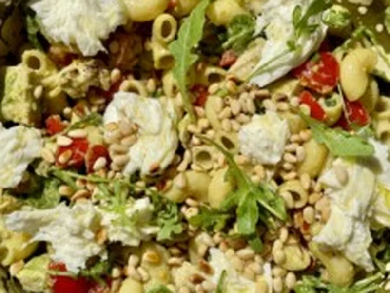 A vibrant, protein-packed pasta salad combining al dente macaroni with tender chicken, crispy pancetta, and fresh rocket. The star is a silky basil pesto dressing enriched with Greek yoghurt, pine nuts, and lemon, creating a lighter yet creamy coating. Cherry tomatoes macerate in garlic and oil to build depth, while torn mozzarella and Parmesan add richness. This dish works as a substantial cold lunch, light dinner, or picnic centerpiece. It's perfect for home cooks seeking restaurant-quality salad without fuss. What sets this version apart is the yoghurt-tempered pesto, which provides indulgent creaminess without heaviness, and the warm pasta tossed while hot, allowing it to absorb the tomato marinade and flavors. It's flexible enough for weeknight dinners yet elegant enough for entertaining.