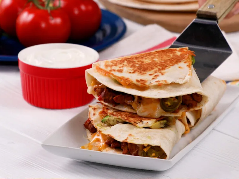 Ground chicken seasoned with taco spice, layered with pico de gallo, cheese, pickled jalapenos, crushed tortilla chips, and avocado inside folded flour tortillas, then pan-fried until golden and crispy. Served with sour cream for dipping.