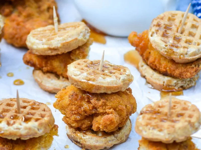 Handheld chicken and waffles combining crispy toasted mini waffles with sliced cooked chicken tenders, secured with toothpicks, and finished with a drizzle of real maple syrup. Perfect for appetizers or casual dining.