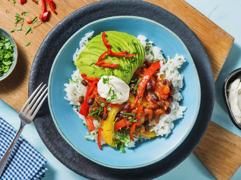 Meatless chili built on black beans, bell peppers, and tomatoes, simmered with spiced aromatics until creamy. Served over jasmine rice with fresh cilantro, sliced avocado, sour cream, and raw red chili for heat and freshness.