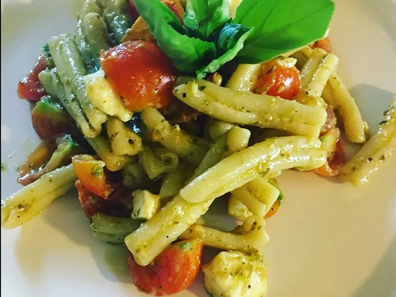 Caserecce con pesto is a refreshing cold pasta salad that celebrates simple Italian ingredients in perfect balance. Tender pasta tubes coat evenly with vibrant basil pesto made from scratch, then tossed with fresh mozzarella chunks and halved cherry tomatoes. The dish combines creamy, herbaceous, and bright acidic notes with a satisfying textural contrast between soft pasta and delicate cheese. This is ideal for warm-weather entertaining, potlucks, or light lunches when you want something substantial yet not heavy. What sets this version apart is the emphasis on quality: hand-pounded pesto preserves basil's volatile oils better than blending, Grana Padano adds umami depth without overpowering, and the technique of cooling pasta with oil prevents clumping. Best served after chilling thoroughly, allowing flavors to meld and the salad to develop complexity. Perfect for anyone seeking a Mediterranean-inspired dish that's manageable to prepare yet feels thoughtfully composed.