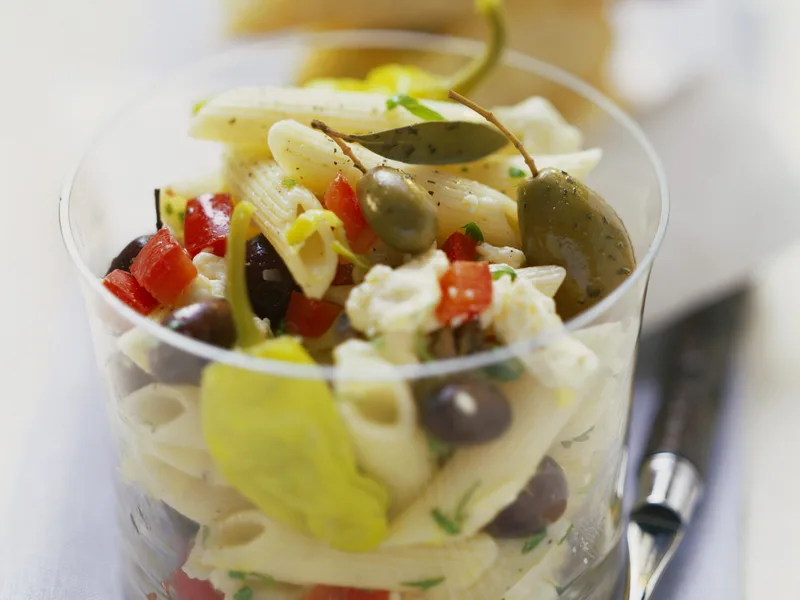Divide pasta salad between two large glasses and arrange olives, caper berries, and pickled peppers on top for garnish.