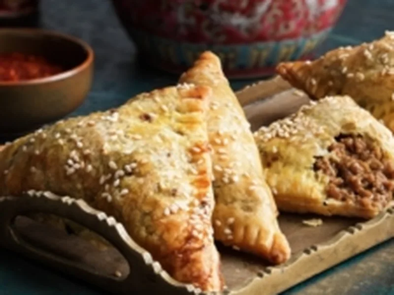 Golden puff pastry squares filled with spiced ground beef curry. Onions, garlic, and aromatic curry powder combine with hoisin and soy sauce in a thickened beef filling, wrapped in butter puff pastry and topped with toasted sesame seeds. Baked until crisp and golden, these savory pastries work as appetizers or light main courses.
