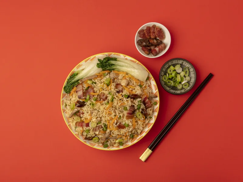 Aromatic fried rice studded with lap cheong, Chinese bacon, and pork liver sausage, steamed with Shaoxing wine then stir-fried with French beans, spring onion, and chilli. Grains stay separate and dry, seasoned with soy and salt for authentic wok flavor.