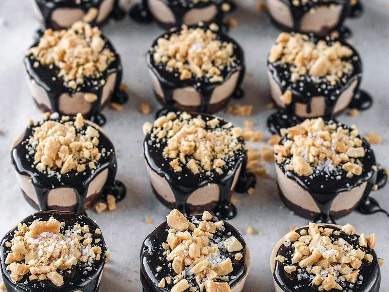 Mini no-bake cheesecake with a crunchy walnut-date base and smooth chocolate-peanut butter filling. Made entirely from raw ingredients and set in the freezer, these bite-sized treats require no oven. Topped as desired.