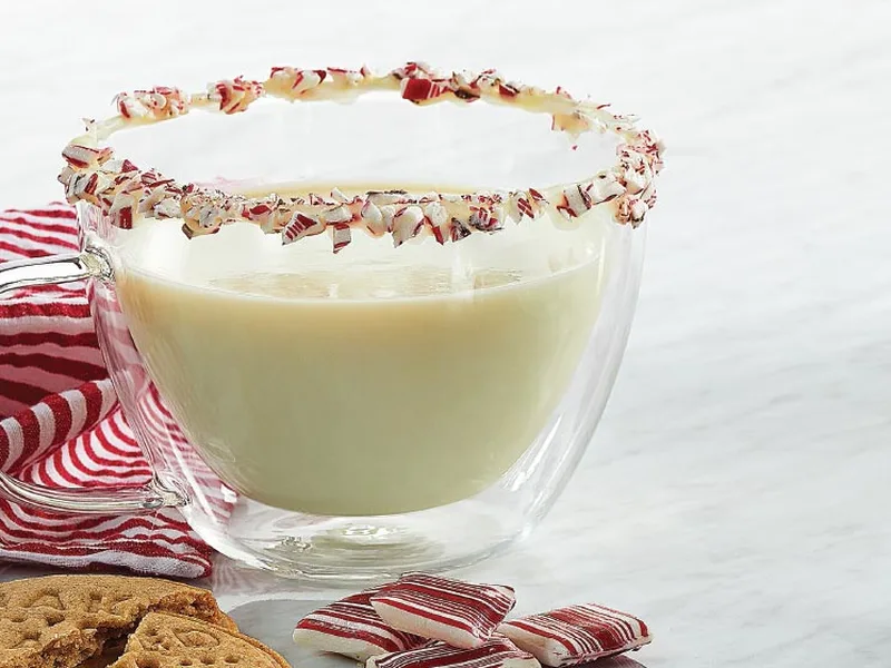Creamy white chocolate and milk beverage infused with fresh mint essence. Warm chocolate coating lines the rim of the cup, topped with crushed mint candies and a cinnamon stick for garnish. Quick stovetop preparation perfect for cold afternoons.