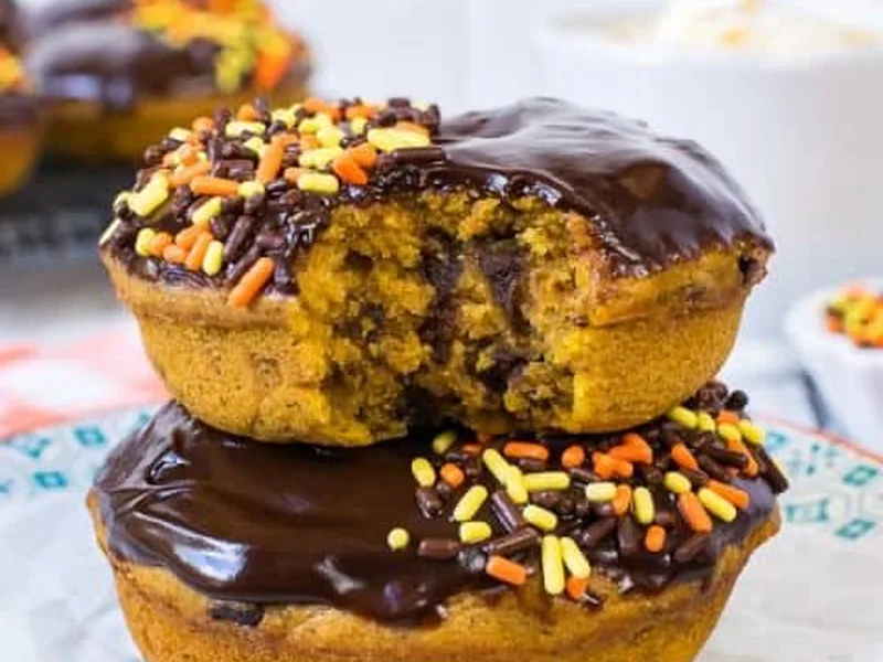 Soft, cake-style donuts infused with warm spices and pumpkin, studded with chocolate chips and finished with a rich chocolate glaze and sprinkles. Baked in a donut pan rather than fried, these are perfect for fall mornings or dessert.