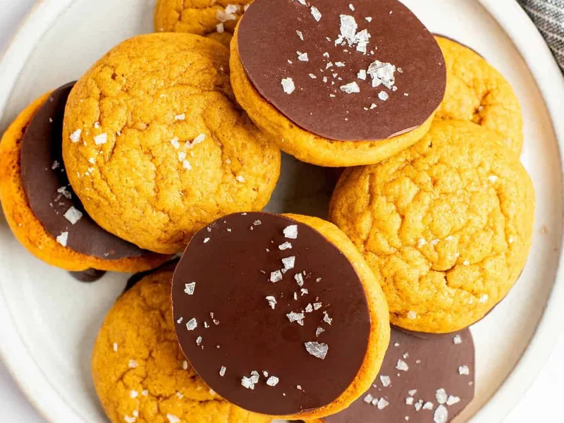 Soft, chewy pumpkin cookies enhanced with warm cinnamon and finished with a rich chocolate coating and flaky sea salt. The pumpkin puree creates tender cookies with subtle fall flavor, while the chocolate dip adds indulgent contrast. Perfect for autumn gatherings, holiday cookie exchanges, or cozy afternoons with coffee. The combination of brown sugar and pumpkin keeps these cookies moist for days, and the sea salt the chocolate coating from simple to sophisticated.