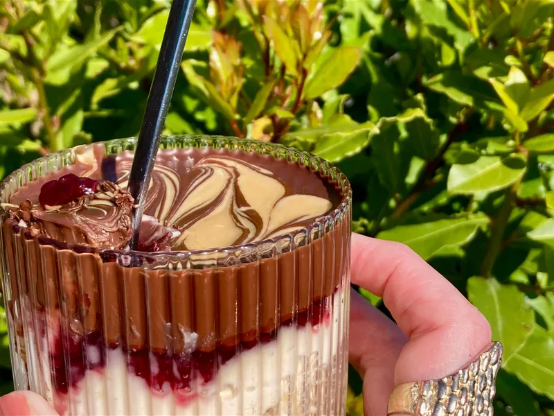 Layered overnight oats with creamy peanut butter yogurt, tart raspberry jam, and a glossy dark chocolate top. Milk is heated gently before pouring over Irish jumbo oats, then chilled in a jar with sweetener, yogurt, jam, and melted chocolate drizzled with extra peanut butter.