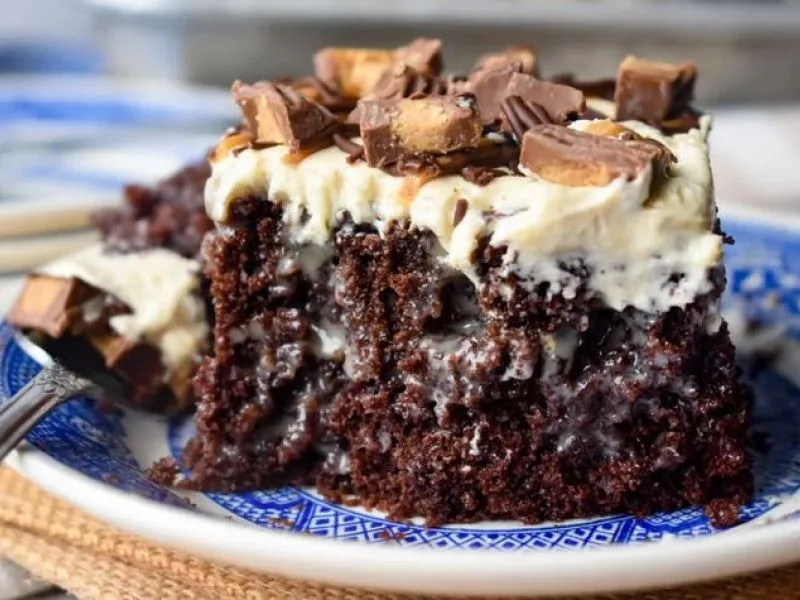 A decadent two-layer chocolate cake infused with hot coffee for depth, spiked with creamy peanut butter throughout. The signature technique involves piercing warm cake and soaking it with sweetened condensed milk mixed with peanut butter, allowing the liquid to absorb into the crumb for moisture and richness. Topped with peanut butter whipped cream and finished with fudge sauce and peanut butter cups, this dessert delivers intense cocoa and peanut butter flavors in every bite. The tender crumb contrasts beautifully with the thick, creamy topping. Perfect for chocolate-peanut lovers seeking something beyond standard layer cakes. Serve at gatherings, celebrations, or when you want an indulgent, showstopping dessert that feels special yet approachable.