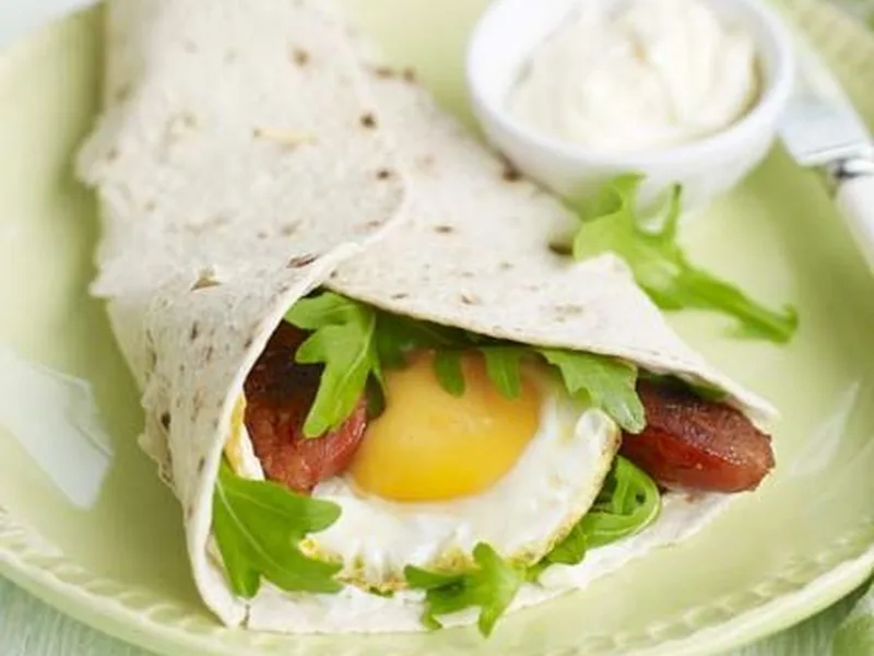 Crispy pan-fried chorizo halves and fried eggs wrapped in flatbread with rocket, capers, and mayo. The chorizo renders its oil into the pan for cooking the eggs, creating a unified flavor base. Fold the wraps carefully to contain the runny yolk without spillage.