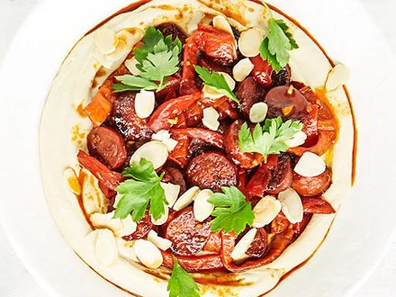 Spanish-spiced hummus topped with crispy chorizo, roasted red peppers, and toasted almonds. Warm chorizo releases its smoky oil into the mix, creating a richly flavored dip that balances creamy chickpea base with bright vinegar and fresh parsley garnish.