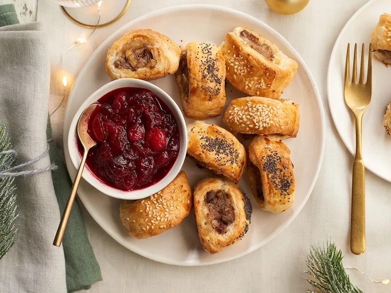 Sausage rolls keep in an airtight container at room temperature for up to 2 days. Cranberry sauce stores refrigerated for up to 1 week. Reheat rolls gently in a low oven.