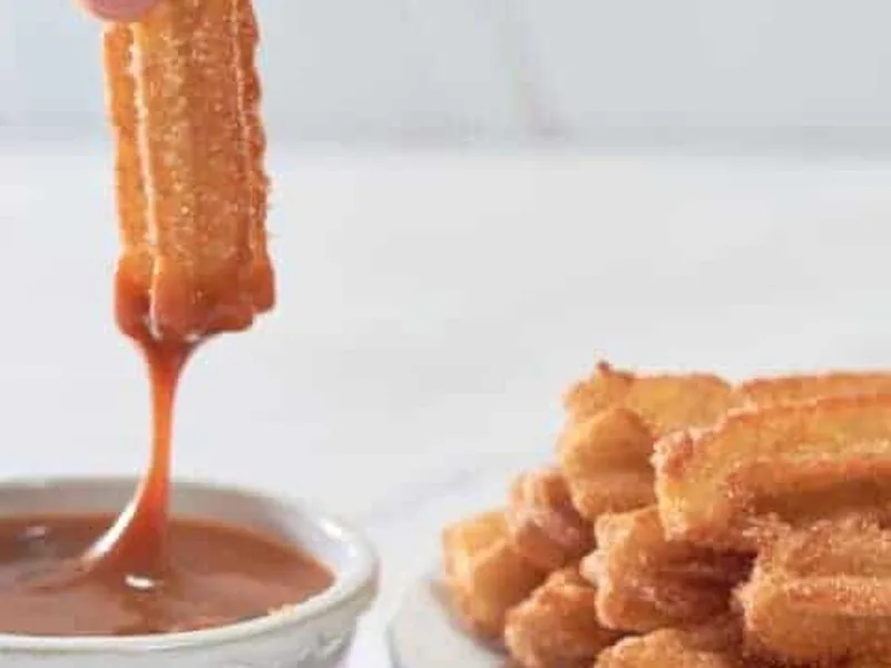 Serve churros warm with caramel sauce in a small bowl for dipping