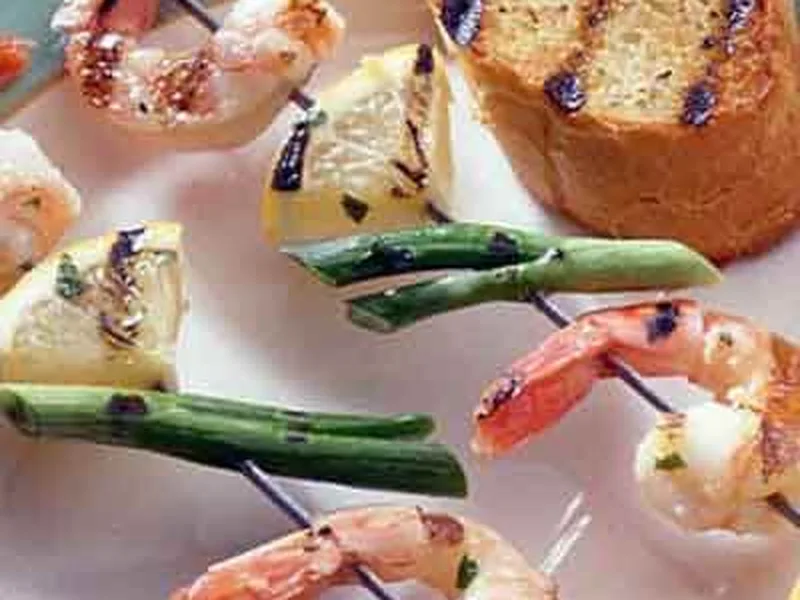 Thread shrimp and vegetables snugly on skewers to prevent spinning during turning. If using wooden skewers, soak them 30 minutes prior.