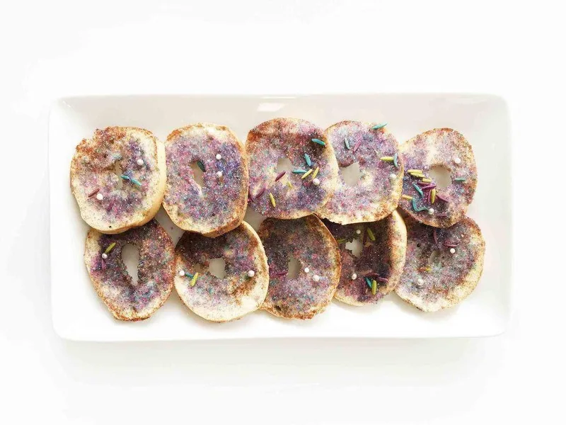 Mermaid Treasure Bagel Crisps are sweet, crunchy baked snacks made from sliced mini bagels coated in buttery cinnamon sugar. These bite-sized treats combine the chewy interior of a bagel with a crispy, caramelized exterior and sparkly sugar crystals that catch the light. The flavor is warm cinnamon with subtle sweetness from both natural sweetener and colored sugar, making them feel indulgent yet simple. Perfect for snack lovers, kids' lunchboxes, and anyone craving a quick sweet fix, these crisps are best served fresh while still warm and crispy. This version stands out by using colored sugar crystals for visual appeal and combining natural sweetener with sugar for complex sweetness, plus the double-slice technique creates uniformly thin, evenly baked crisps that stay crunchy longer than traditional buttered bagel toasts.
