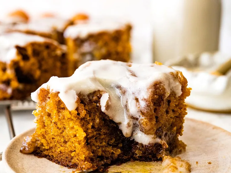 Tender, spiced pumpkin cake swirled with cinnamon-brown sugar filling and topped with tangy cream cheese glaze. Oil-based batter keeps the crumb moist while the swirl adds richness and warmth. Perfect for fall gatherings, potlucks, or casual family desserts. This version balances pumpkin subtlety with bold cinnamon notes, finishing with a smooth glaze that sets slightly as it cools.