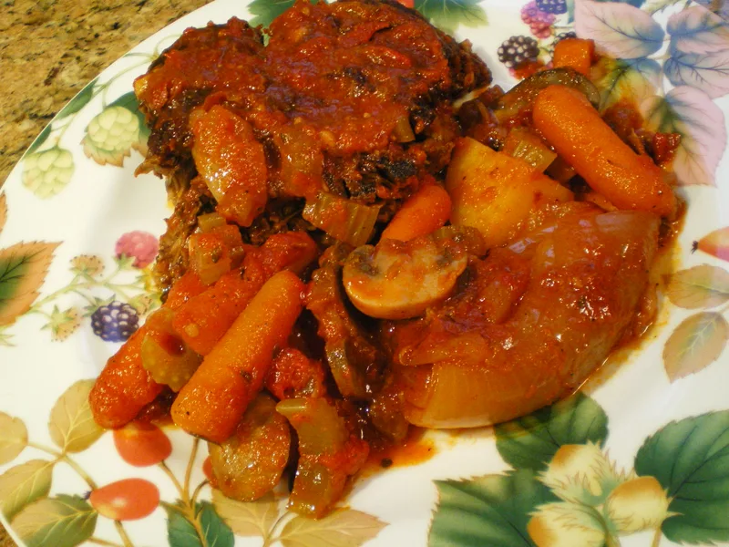 A rustic one-pot braise that transforms tough beef chuck into tender, fall-apart meat through slow cooking with crushed tomatoes, aromatic vegetables, and fresh herbs. The deeply caramelized exterior develops during the initial sear, while the moist braising environment ensures juicy results. Serve family-style for Sunday dinner or special occasions, surrounded by softened carrots, mushrooms, and onions. This version emphasizes proper browning technique and frequent basting to build rich, concentrated pan juices that become the essential sauce.
