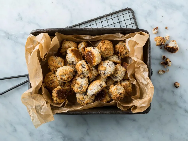 Dense, chewy confections combining toasted coconut flakes, ground hazelnuts, and chocolate chunks bound with sweetened condensed milk. Baked briefly at 180°C to set, then cooled on a rack. Makes approximately 30 balls with minimal mixing required.