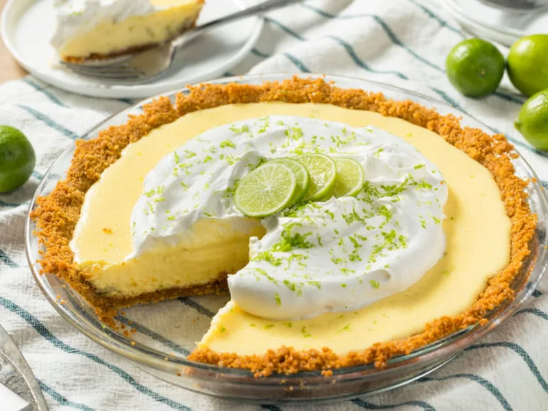 Classic American key lime pie with a buttered graham cracker crust, sweetened condensed milk filling, fresh lime juice, and topped with whipped cream. Bake at 180°C for a perfectly balanced, tangy-sweet dessert with a light, creamy texture that melts on the palate.