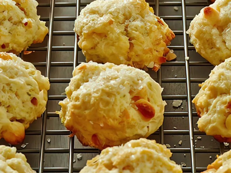 Commercial-scale drop scones studded with sweetened coconut, white chocolate chips, and macadamia nuts, brightened with fresh lime juice and zest. Mixed until just moistened, shaped with a #50 scoop, brushed with melted butter and sanding sugar, then baked until lightly golden. Serve warm or at room temperature.